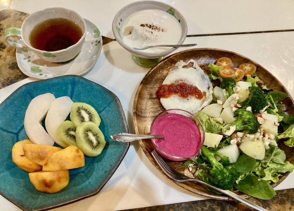 朝の始まり。お宿の素敵すぎる愛のこもったフルーツと地元オーガニックお野菜たっぷりブランチ。赤ビーツ豆乳ドレッシングで女子度💖アップ!セルフ💕ラブ!でハッピーになる😊ありがとうございます🙏