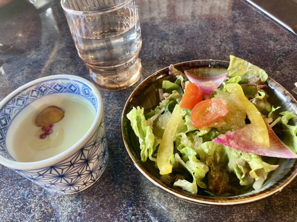 さつまいものポタージュと新鮮なサラダ🥗。メインは季節のお野菜とシラスのペペロンチーノパスタを頂きました。