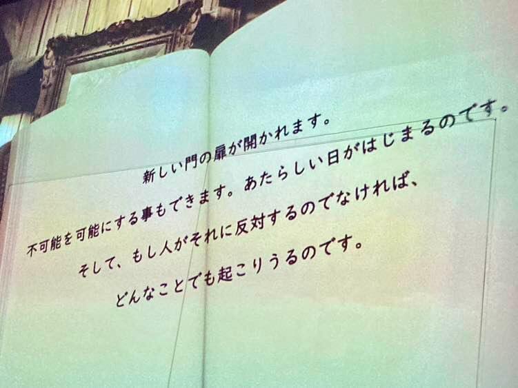 ミニシアターの最後のメッセージ「新しい門の扉が開かれます。不可能を可能にする事もできます。新しい日が始まるのです。そして、もし人がそれに反対するのでなければ、どんなことでも起こりうるのです。」