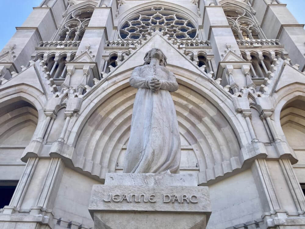 教会の入り口にはジャンヌダルクの像。凛とした勇気を感じます。