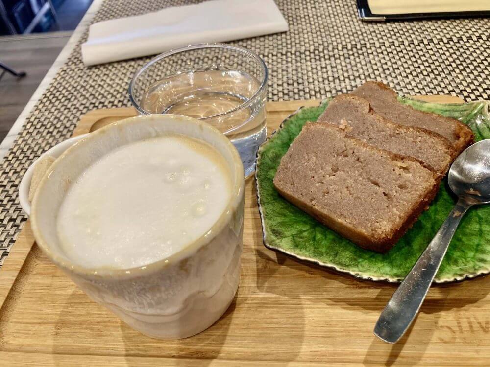 歩き疲れると素敵なカフェでリラックス。カフェクレームと栗のケーキ🌰。器もとっても素敵💓