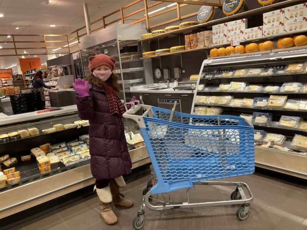 スーパーに入る時は、まずはマスクを着け😷、りんご1つ買うにも、必ずこの巨大なカートで入ることがソーシャルディスタンスを保つ為に、義務付けられています。スーパーアルバートハインのチーズ🧀売り場。
