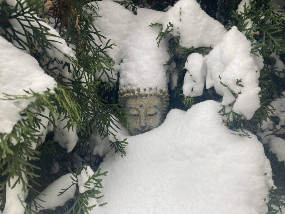 庭の仏さまも雪の中へ、😆!